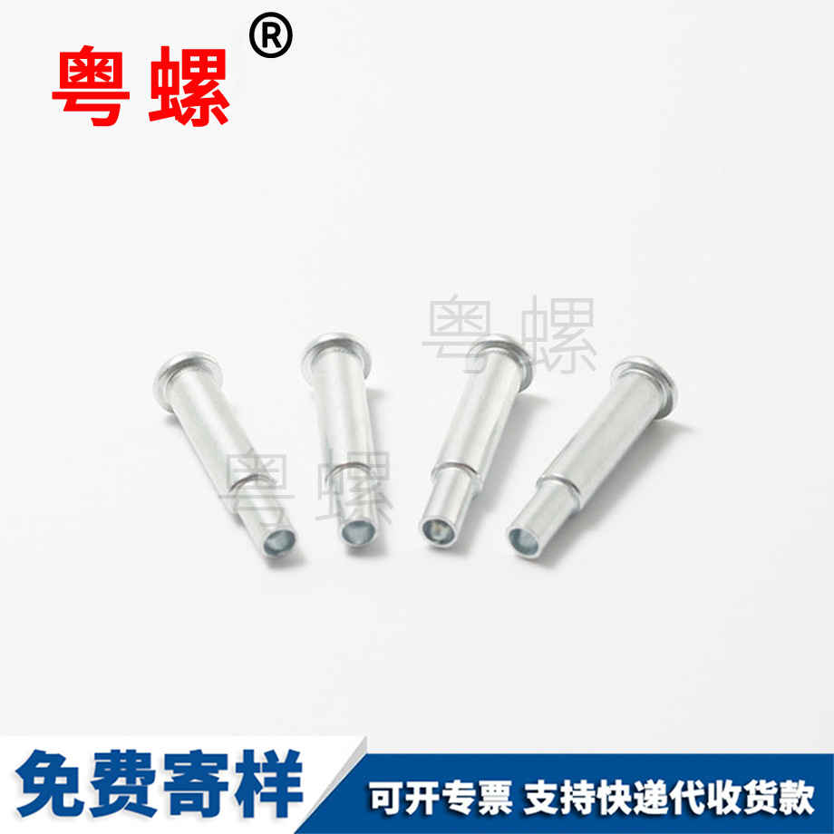 廣東粵螺五金實(shí)業(yè)有限公司解決其技術(shù)問題所采用的技術(shù)方案是 一種鐵路貨車專用拉鉚 釘,具有拉鉚釘主體、套環(huán),拉鉚釘主體由拉鉚釘頭部、拉鉚釘桿身組成,拉 鉚釘桿身由上到下依次為光桿段、鎖緊環(huán)槽段和尾部螺紋段,在尾部螺紋段處 設(shè)置有保護(hù)件,設(shè)置保護(hù)件是為防止尾部螺紋段在使用過程中出現(xiàn)生銹、壞牙、 碰撞變形等情況。具體的說所述的尾部螺紋段具有外螺紋或內(nèi)螺紋,所述的保護(hù)件為螺母 或螺栓。